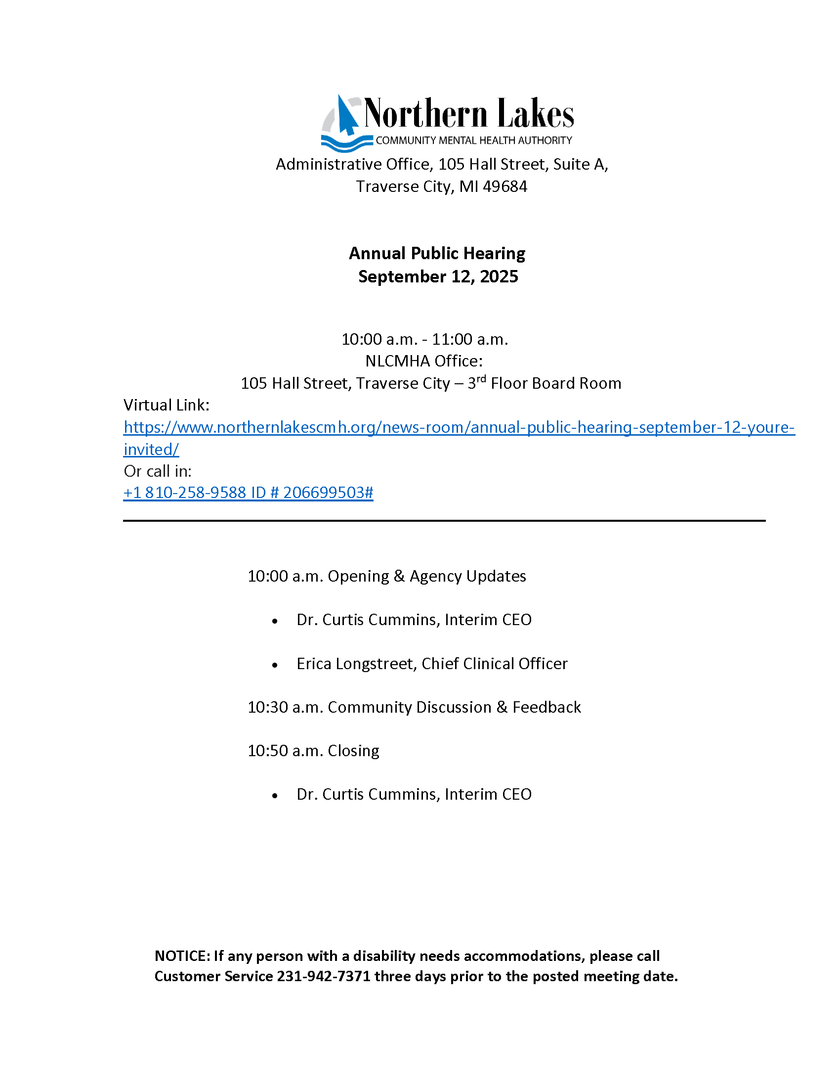 Regular Board Meetings are open to the Public and begin at 1:00 p.m. on the days listed below. If any person with a disability needs accommodations, please call the CEO’s Office three days prior to the posted meeting date at 231-935-3538. To contact the Office of the CEO, email the Executive Administrator.